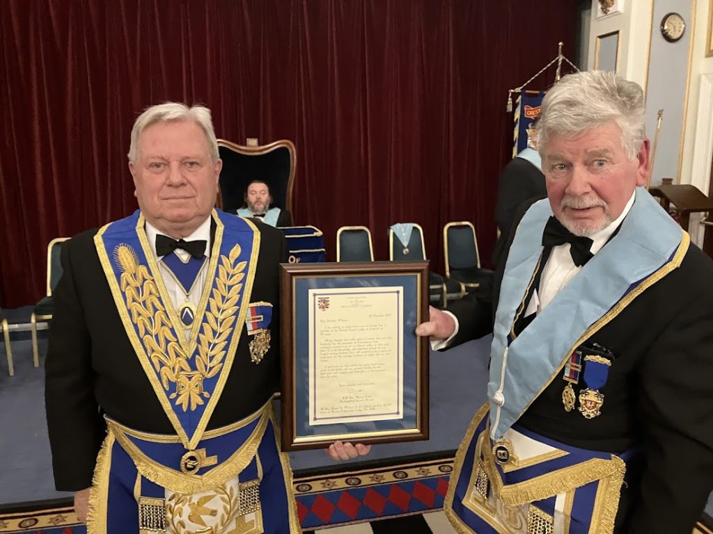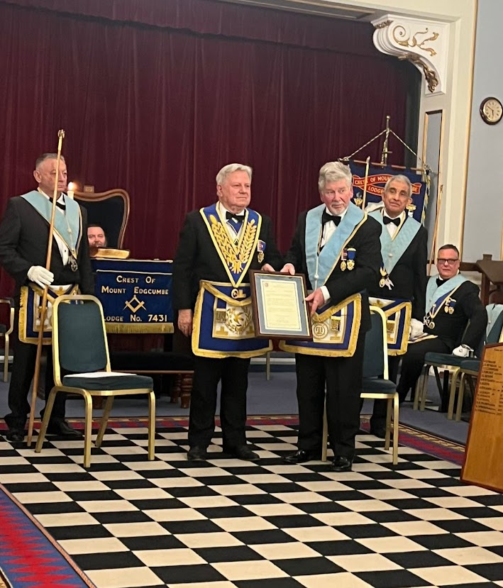 On Saturday 20th December 2025, W.Bro David Wilmot was presented with his 50 year in Freemasonry certificate by W.Bro John Peters (Past Metropolitan Grand Inspector) at the Christmas meeting of Crest of Mount Edgcumbe Lodge No 7431 . The meeting was held at Mark Masons Hall 86 St James’s Street London and attended by many guests and visitors, including wives, partners and friends of the members.